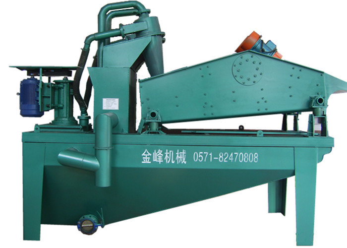工作過程:泥漿水流入清洗槽,通過耐磨泵將泥漿水送入濃縮器,經過濃縮器把污水和砂分離,砂經噴頭到脫水篩,脫水后送入輸送帶。污水回到反料箱,分流入清洗槽,多余部分外泄。